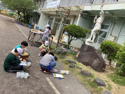 教室ではなく、運動場に出て描く活動に、「外で何かするってやっぱいいな~!」と、開放感を感じながら、活動に望むことができました。