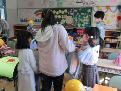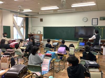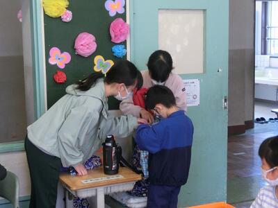 朝、1年生の教室を覗くと、たくさんの6年生が1年生のお手伝いをしていました。