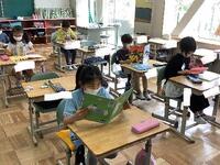 3年生が読書の本を借りている様子です。列にぴしっと並んでいてとてもよいですね。また、教室で待っている間も静かに借りた本を読んでいて、とてもすてきでした!