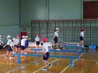 4年生の朝運動の様子です。変化走の4つの種目の内、平均台とフラフープ跳びの練習風景です。平均台は素早く渡れるように、フラフープ跳びは、手や腕を上手に使って跳ぼうと一生懸命練習していました。