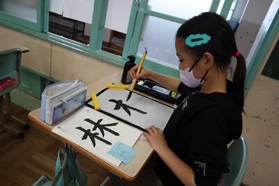 4年生の書写の授業では、集中して毛筆の学習に取り組んでいます。どのようなことに気をつけて活動するか、自分でめあてをもって、進めることができます。