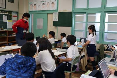 4年生の算数の授業では、折れ線グラフの見方について、子供たちが自分の考えをもち、学び合うことができています。タブレットを使いながら、わかりやすく発表しています。