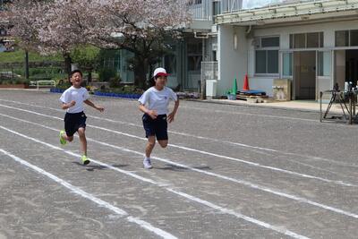あたたかな春の日差しの下で、5年生の体育の授業では、50メートル走を行っています。自分のめあてに向かって、一人一人が全力で取り組んでいます。