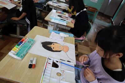3年生の教室では、図工の授業に子供たちが真剣に取り組んでいます。自分の顔を描いて、絵の具で上手に色塗りも進めています。