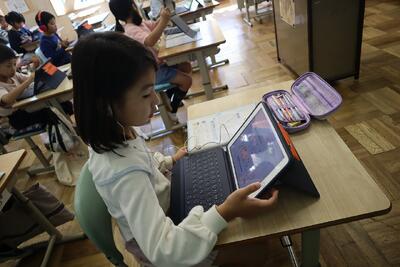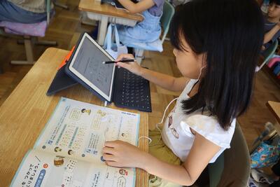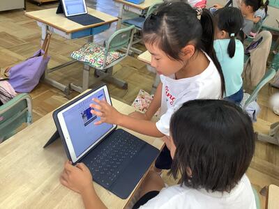 1年生が図工の作品ふりかえりカードをタブレット端末を使って、作成しています。写真を貼り付けて、作品の紹介ができます。