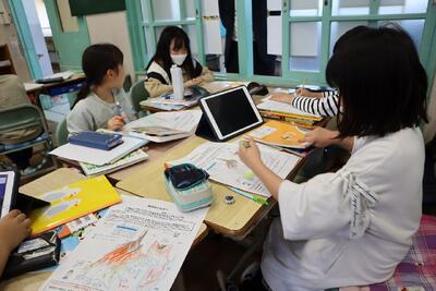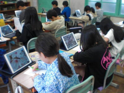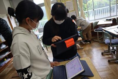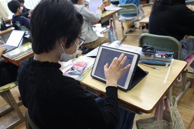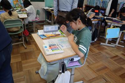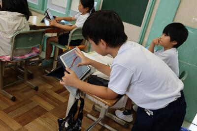 6年生の理科の授業では、タブレットをつかって、自分の考えを書き込み、その後で、友達と考えを伝え合いながら学習を進めてきます。友達の考えと自分の考えを比較することで、様々な考え方に触れ、学びを深めることができます。
