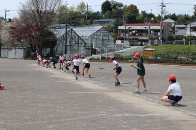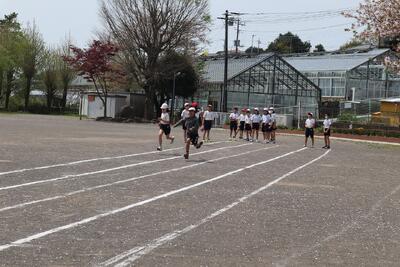 あたたかな春の日差しの下で、5年生の体育の授業では、50メートル走を行っています。自分のめあてに向かって、一人一人が全力で取り組んでいます。