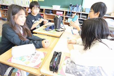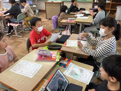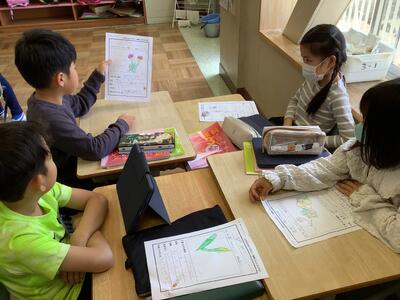 3年生の、理科での子どもたちの様子です。前時に校庭で観察した植物について、観察カードを見せながら班で紹介をしました。見つけた場所、色、形、大きさなどを上手に伝えられました。