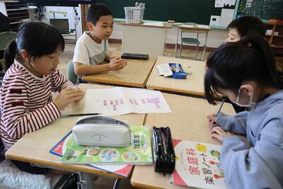 2年生が、国語の授業で漢字を学習しています。1年生から漢字を学習している子供たち、自分の知っている漢字の形と比べて、似ているところと違いを考えて学習を進めています。