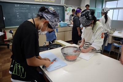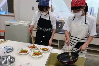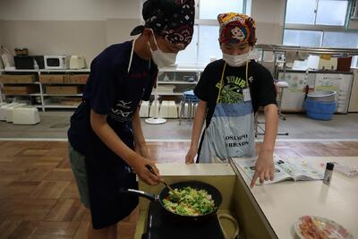 6年生の家庭科の授業では、野菜とベーコンを炒める調理実習を行いました。家庭科の学習2年目の6年生は、さすが手際よく、作業を進めていきます。野菜の切り方や炒め方にも気をつけて、野菜とベーコンの炒め物の完成です。