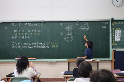 3年生の算数の授業では、友達がどのような工夫をして計算をしているのか、考えて自分の言葉で伝えることができました。自分や友達の考えを伝え合うことで学びが深まります。