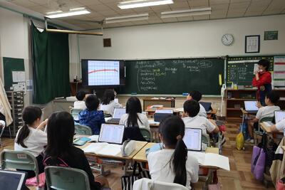 4年生の算数の授業では、折れ線グラフの見方について、子供たちが自分の考えをもち、学び合うことができています。タブレットを使いながら、わかりやすく発表しています。