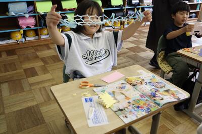 1年生が、図工の授業で、はさみを使って「ちょきちょきかざり」に挑戦しています。折り紙を折り、はさみを使って切り込みを入れていきます。1年生、はさみを上手に使って、すてきな「ちょきちょきかざり」ができました。
