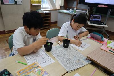 3年生の理科の授業では、ホウセンカとヒマワリを育てて学習を進めています。今日の授業では、ホウセンカとヒマワリの生長のようすを、友達といっしょに楽しみながら観察することができました。色や形、大きさ、においなど、たくさんの気付きがある子供たち、すてきです。