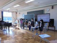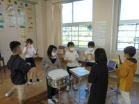 音楽の授業の様子です。「かぼちゃ」という歌に合わせていろいろな楽器を演奏しています。どの楽器から音を重ねていくのがいいか、積極的に話し合い、試していました。