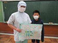 今日から給食週間が始まりました。いつもおいしい給食を作ってくれる栄養士さん、調理員さんに感謝の気持ちをこめて、メッセージカードや家庭科で作った台ふきんを渡しました。