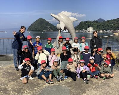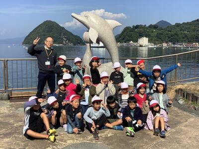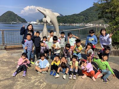 イルカのモニュメントの前で、クラスごとに集合写真を撮りました。