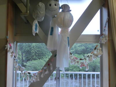 6年生の教室には、たくさんのてるてるぼうずが飾られていました。