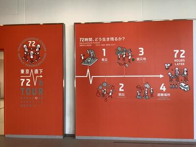 首都直下地震が発生した場合、発生後72時間をどう行動するか、タブレットを使って体験したり、映像から考えたりすることができました。
