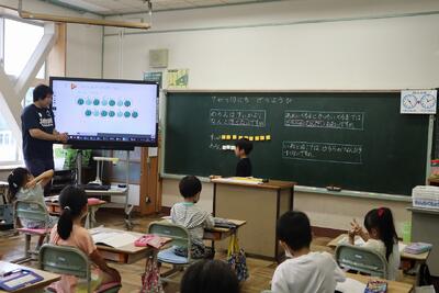 1年生の算数の授業では、「どちらがいくつおおい」の学習をしています。数を比べて、線で結んだり、ブロックを数えたりしながら、集中して授業に取り組んでいます。しっかり鉛筆を持って、算数ノートに書くこともできるようになりました。