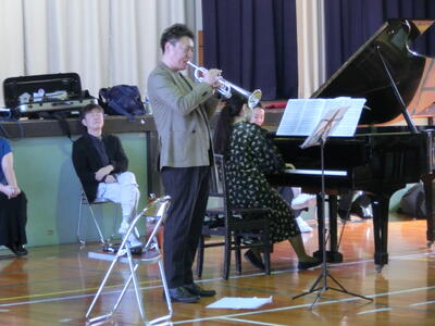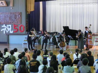 開校50周年を記念して、「みしませせらぎアンサンブル」の皆さんにお越しいただき、演奏していただきました。子供たちは生で聞く楽器や歌声に聞き入っていました。