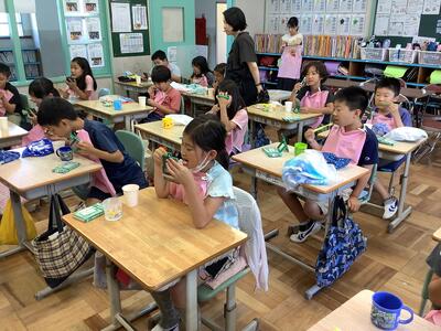 歯科医・歯科衛生士さんに来校していただき、健口教室を行いました。歯の健康を守るために大切なことを教わりました。乳歯と永久歯の違い、虫歯になってしまう可能性のあるお菓子ランキング等を教えていただきました。また、染色液を使い、磨き残しがあるかどうかを確かめていきました。これから、自分がどの歯を意識して磨けば良いのかを知ることができたと思います。正しい歯磨きの仕方も教えてもらったので、ぜひお家でも実践してみてくださいね。保護者の皆様、持ち物の御準備をありがとうございました。