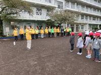 朝、池の前で、1年生にスクールガードさんを紹介する会が行われました。最初に6年生の代表児童から、日頃の感謝の気持ちが伝えられました。