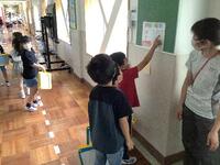 生活科の授業では「沢地小学校のことをもっと知ろう」という活動をしています。今日は、2年生が書いた部屋紹介のポスターを探して学校中を探検し、シールを集めました。