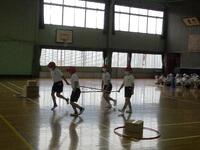 4年生の朝運動の様子です。変化走の4つの種目の内、平均台とフラフープ跳びの練習風景です。平均台は素早く渡れるように、フラフープ跳びは、手や腕を上手に使って跳ぼうと一生懸命練習していました。