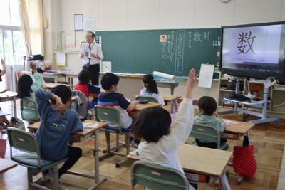 1年生の算数の授業では、教科書の絵をみながら、10までの数の学習をしています。絵の上におはじきを置いていきます。「いくつかな。」と考えながら、自分で確かめていきます。元気に手をあげて発表もはりきっていますね。