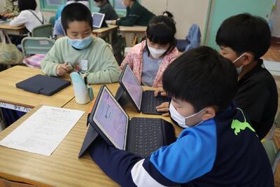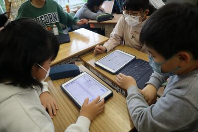 5年生の学活では、話合い活動が行われています。議題について、小柱にそって自分の考えを出し合ったり、小グループで意見をまとめたりして活動を進めていきます。司会者、記録者を立て、自分たちの力で話合っていきます。今日の学級会では、「運動会のスローガン」について話し合いました。メタモジを使うと、それぞれのグループの意見を共有できるので、話合いも深まります。