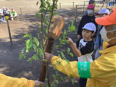 苗木を杭で固定しました。スクールガードさんたちも杭打ちを手伝ってくれました。
