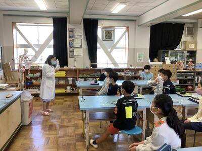今日は、石灰水を使って、物が燃えた後の空気はどのように変化したのかを確かめました。実験の前に理科支援員の先生から、危険を伴う実験への心構えについてお話をいただき、真剣に取り組むことができました。