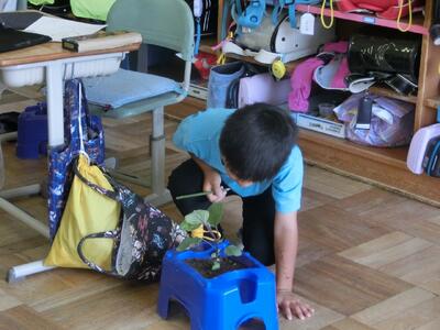 1年生の生活科では、子供たちがあさがおのたねをまきました。まずは、あさがおのたねをよく観て、絵を描きました。その後は、自分の植木鉢に土を入れて、たねを植えました。あさがおの芽が出るのが、楽しみですね。