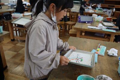 4年生の図工では、絵画技法の一つであるドリッピングを使って、子供たちが楽しみながらいきいきと活動しています。ストローで息を吹きかけて、絵の具で模様をつくっています。また絵の具をつけたビー玉を動かして、偶然にできる線をいかして、模様を描いていきます。子供たちの表情がとってもすてきです。楽しみながら活動することができました。