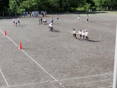 3年生の体育の授業では、リレーのバトンパスの練習が始まりました。今日は、直線コースでバトンパスの練習をしながら、リレーをしました。子供たちは、タイミングを見ながら声をかけ、一生懸命取り組むことができました。頑張る友達へのやさしい声かけも素敵ですね。