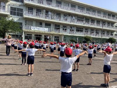 朝の時間、保健体育委員会の児童が1年生の教室へ行き、運動会に向けてラジオ体操の練習をしていました。
