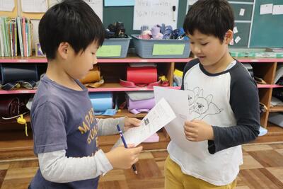 1年生の国語の授業では、子供たちがひらがなの学習に取り組んでいます。子供たちは、ひらがなの字形に気をつけて書いたり、読んだりしながら学びを積み重ねています。じっくりしっかり学習に集中できる1年生、立派ですね。