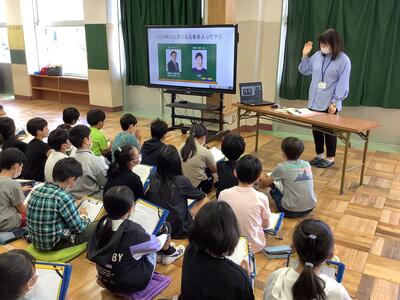 5年生の総合的な学習の時間では、「福祉」について学習していきます。今日は三島市の社会福祉協議会の方々をゲストティーチャーとしてお招きして、講話をしていただきました。