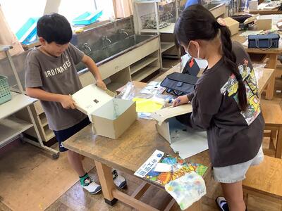 5年生の図工の様子です。自分の思い描く世界を箱の中に創作する単元です。自分の設計図を基に楽しそうに作成していました。