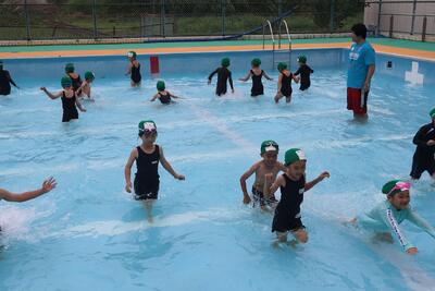 3年生体育の水泳の授業では、子供たちが自分のめあてにむかって、活動しています。今日はとても良いお天気です。