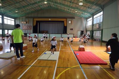 3年生の体育の様子です。外ではキックベース、体育館ではマット運動を行なっており、今日はマット運動の時間でした。
