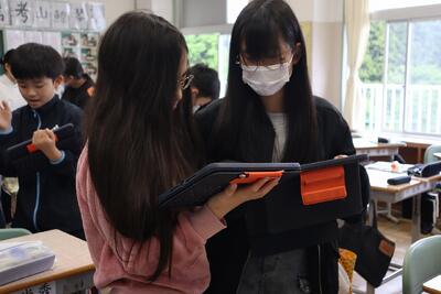 6年生の理科の授業では、タブレットをつかって、自分の考えを書き込み、その後で、友達と考えを伝え合いながら学習を進めてきます。友達の考えと自分の考えを比較することで、様々な考え方に触れ、学びを深めることができます。