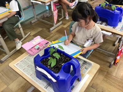 生活科の学習で、アサガオの観察を行いました。新しい葉が出てきている子も多く、葉の形や葉脈の様子など、細かい部分までよく見て観察カードにかいていました。