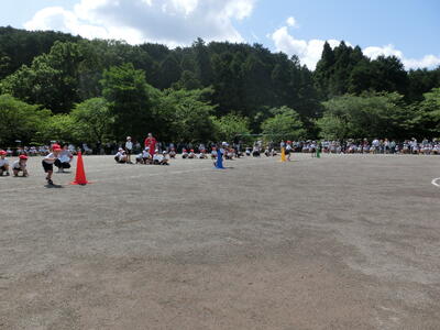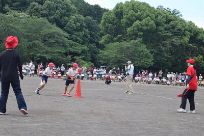 学校対抗リレー「バトンをつないで」では、どのチームも上手にバトンをつなぎ、大接戦となりました。