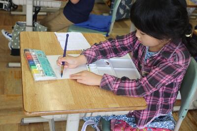 2年生から、絵の具をつかっての活動が始まります。今日の図工の授業では、絵の具セットの使い方をしっかり覚えました。初めての活動に、ワクワクドキドキの2年生。しっかり取り組む姿が立派でした。水の量で、絵の具の色合いが変わることにも気づいています。