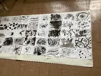 6年2組の図工の様子です。いろいろな物を筆にして墨で描きました。「おもしろ筆」という題名の通り、おもしろい素材(葉、枝、歯ブラシ、綿など)を使って素敵な作品がたくさんできました。