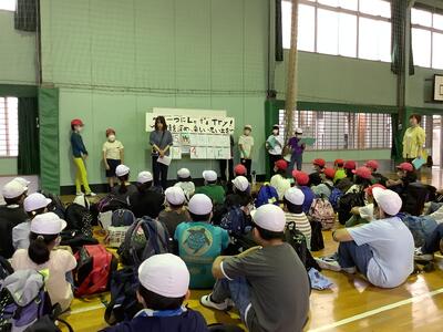出発式での様子です。この自然教室の中で、①自分で考える ②友達の良いところを探す ③家族や周りの方々に感謝する…ということを意識してみましょうと、校長先生からお話がありました。