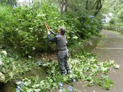 紫陽花の剪定作業に集まっていただいた「粋なおやじの会」の皆様、「地域学校協働本部」の皆様、暑い中、本当にありがとうございました。おかげさまで通学路がとてもきれいに明るくなりました。来年もきっと素敵な紫陽花の花がたくさん咲くことと思います。