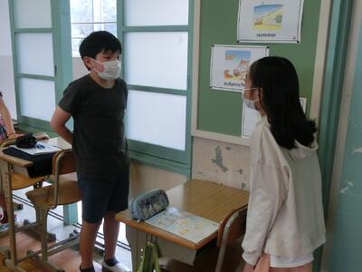 「Hello」、「I'm 〇〇.」、「NIce to meet you.」のフレーズを使ってあいさつの練習をしました。